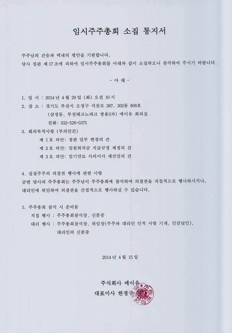[주총] 2014년 4월 29일 임시주주총회 소집 통지